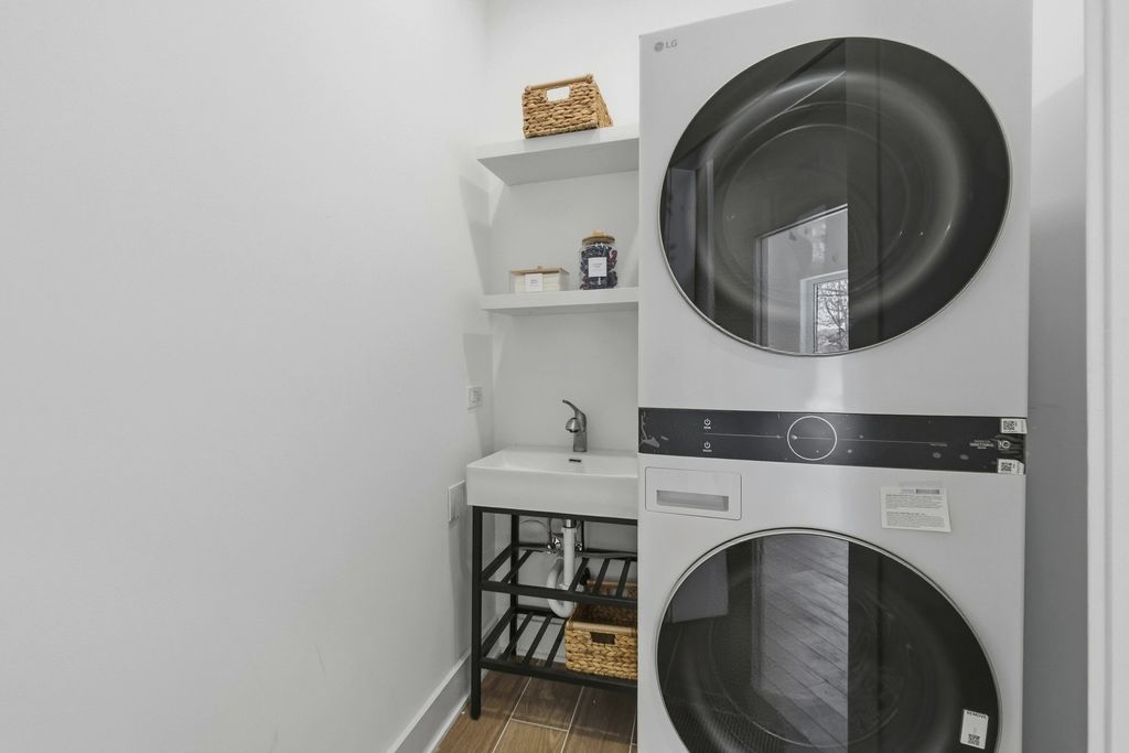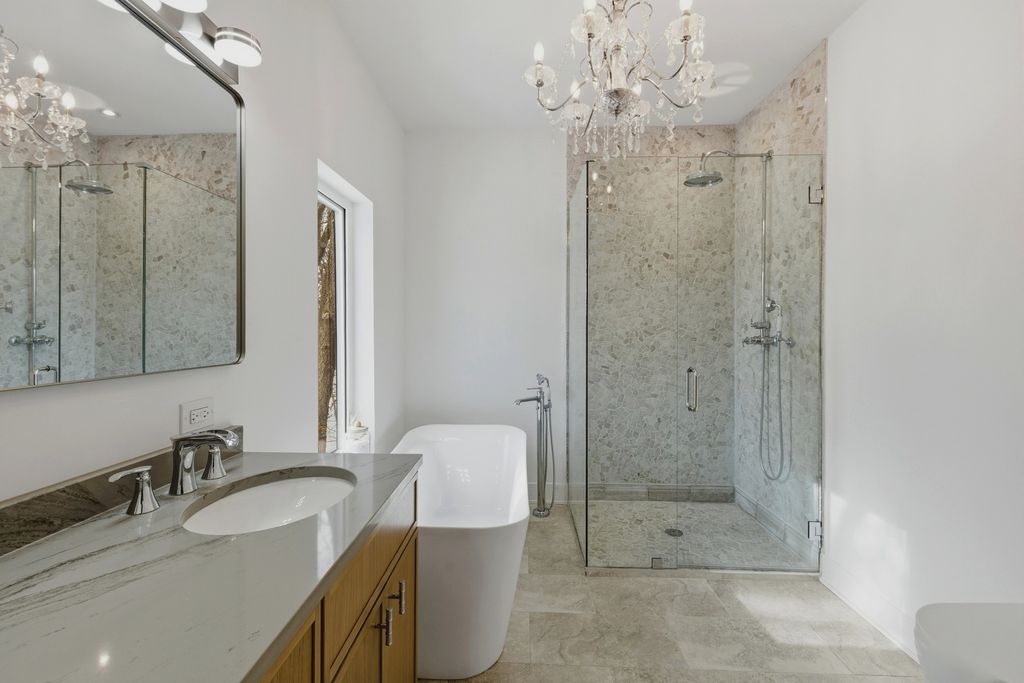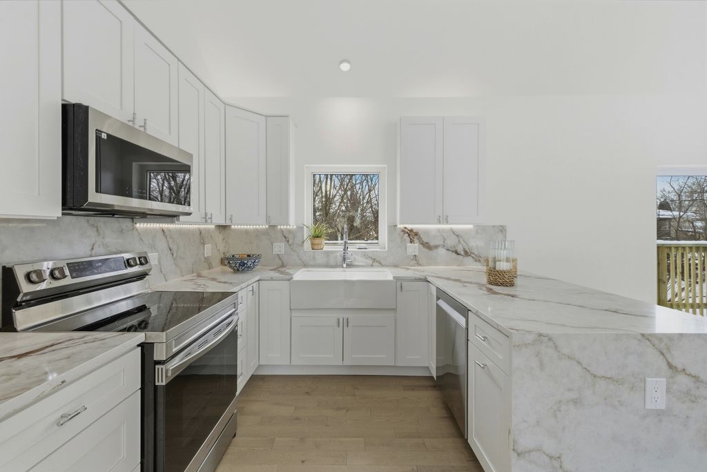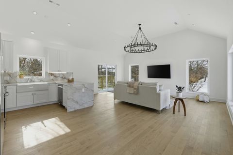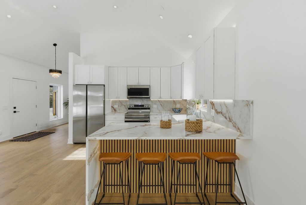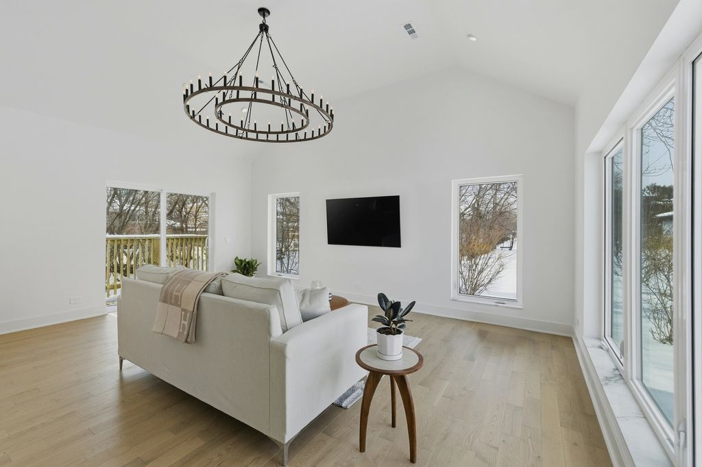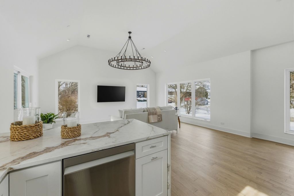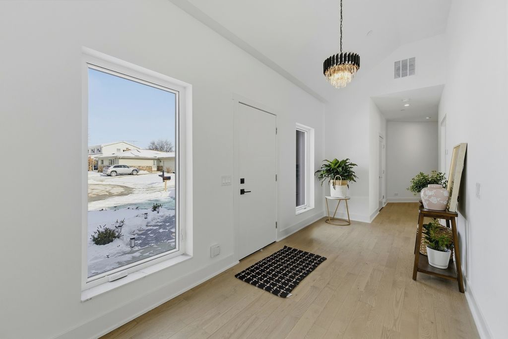 Discover this beautifully designed new-construction single-family home overlooking a serene creek, blending modern luxury with natural surroundings. Offering 2 bedrooms, 2 bathrooms, plus a versatile office or multipurpose room, the home features high-end, bespoke finishes throughout. Natural red oak hardwood floors, soaring ceilings, and expansive European-style windows fill the home with natural light. The open living area is enhanced by architectural lighting and elegant chandeliers. The kitchen showcases quartz countertops and full quartz backsplash with a rainfall-edge peninsula, Samsung appliances, and custom panel detailing with accent lighting. Quartz-trimmed window parapets add architectural interest in the kitchen, living room, and foyer. The primary suite offers a spa-like bath with a natural stone walk-in shower, freestanding soaking tub, wall-hung toilet, and dual sinks, with direct access to a private brick patio. A dedicated laundry room includes an LG washer and dryer, sink, and storage. Exterior highlights include a natural stone front facade, brick driveway, and a wood deck with concrete steppers. Sliding doors from the kitchen create seamless indoor-outdoor living, ideal for entertaining or enjoying peaceful creek views. Located in District 57 and just a short distance to Mariano's, the train station and parks.