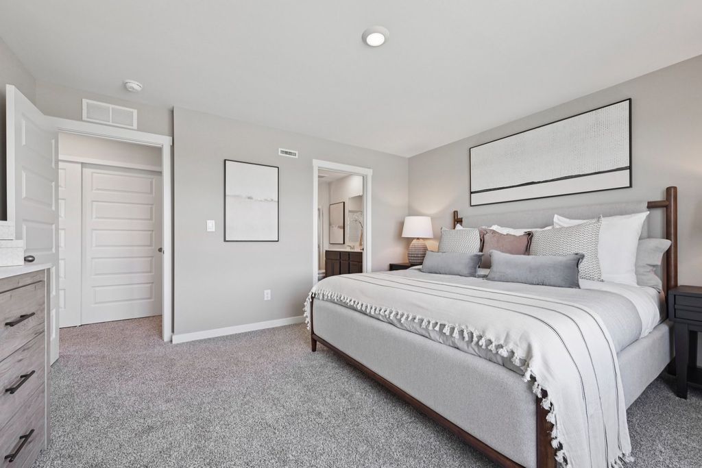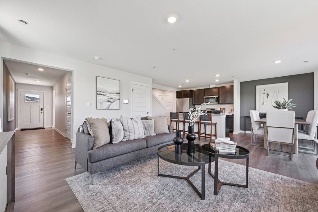 Discover yourself at 3531 Richardson Circle, Yorkville, IL, a beautiful new home in our Grande Reserve community. This townhome will be ready for a SPRING move-in! Homesite includes a fully sodded yard that is maintained throughout the year as well as snow removal in the winter. This Portsmouth townhome plan offers over 1,845 square feet of living space with 3 bedrooms plus a loft, 2.5 baths, a mudroom and a 2-car garage. As soon as you step inside, you'll be greeted by our open concept living area, featuring luxury vinyl plank throughout the main living areas. The expansive kitchen overlooks the dining and great room areas, making it the ideal space to entertain. Additionally, your kitchen features designer 36-inch cabinetry, a spacious island with quartz countertops, and pantry. Enjoy your large primary bedroom with a walk-in closet and connecting en suite bathroom. The rest of the upper level features a laundry room, secondary bedrooms with a full second bath, and linen closet. All Chicago homes include our America's Smart Home Technology, featuring a smart video doorbell, smart Honeywell thermostat, smart door lock, Deako smart light switches and more. Exterior and interior photos are of similar home and model home. Actual home built may vary.